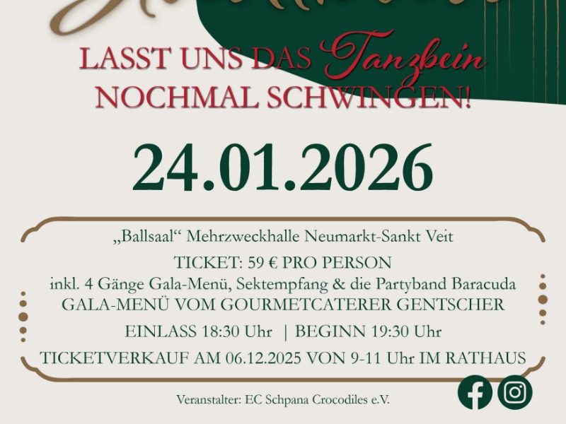 Der EC Schpana Crocodiles hat sich entschlossen den Stadtball nach der letzten tollen Ballnacht ein weiteres mal auszurichten.<br>Wichtig!!!!!<br>Der Kartenvorverkauf ist am Samstag den 06.12.2025 von 09.00 Uhr bis 11.00 Uhr im Rathaus Adlstein.